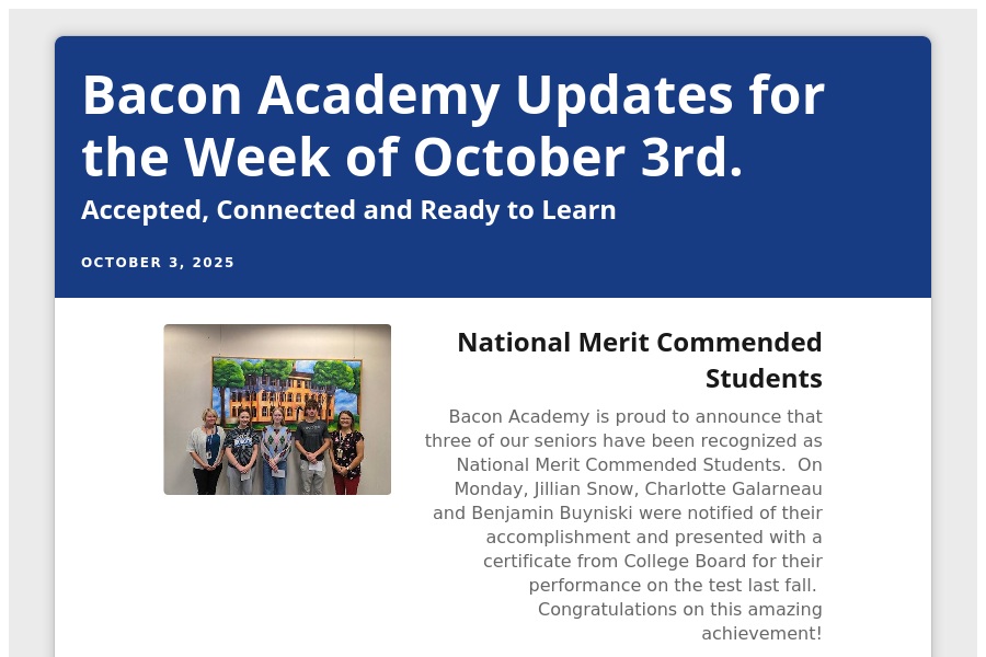 Bacon Academy Updates for the Week of October 3rd. Accepted, Connected and Ready to Learn October 3, 2025 National Merit Commended Students . . .