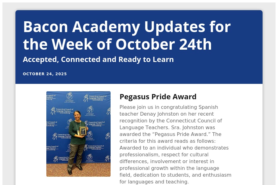 Bacon Academy Updates for the Week of October 24th Accepted, Connected and Ready to Learn October 24, 2025 Pegasus Pride Award Please join . . .