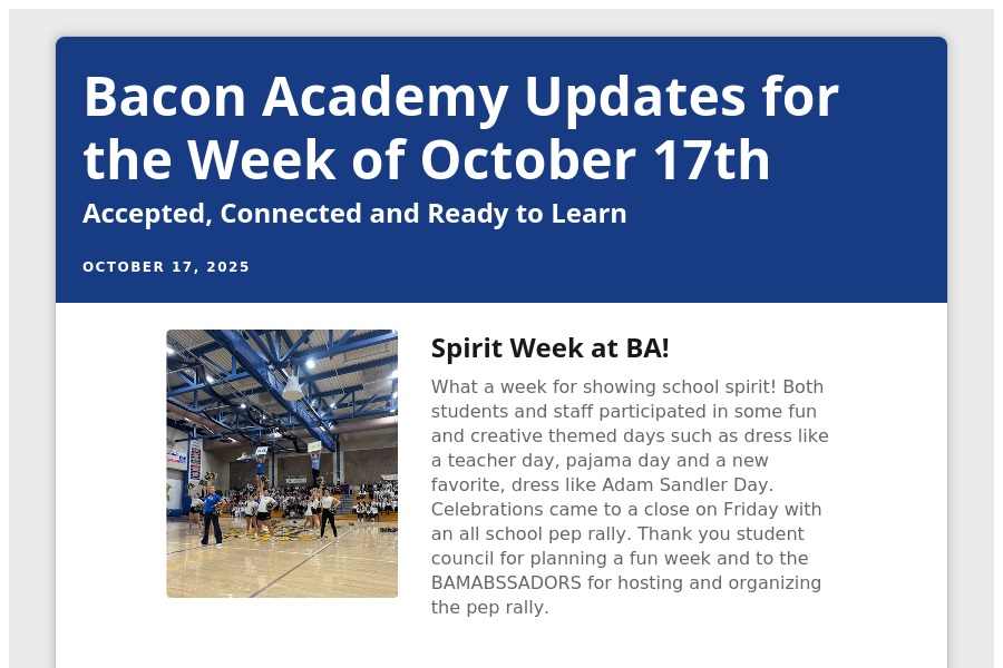 Bacon Academy Updates for the Week of October 17th Accepted, Connected and Ready to Learn October 17, 2025 Spirit Week at BA! What a week f. . .